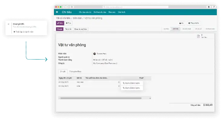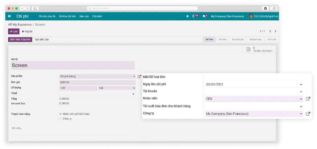 Ghi lại chi phí của công ty và nhân viên, tự động hạch toán và thanh toán hóa đơn.