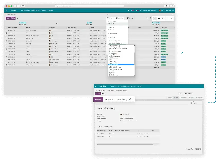 Phân quyền phê duyệt chi tiêu nhân viên trước khi chuyển sang hồ sơ kế toán.