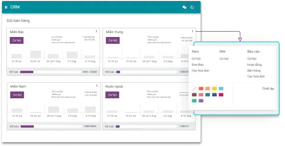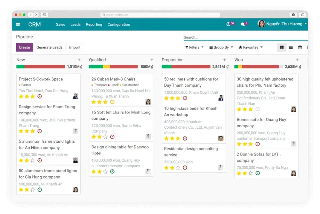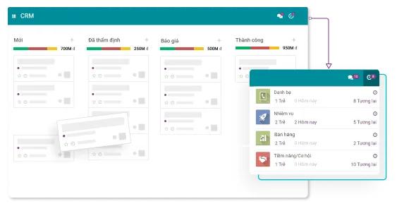 Quản lý xuyên suốt quy trình bán hàng từ giai đoạn Tiếp cận, Thẩm định, Gửi báo giá, Chốt đơn. Giao diện đươc thiết kế theo dạng Kanban trực quan, giúp người dùng không bỏ sót bất cứ thông tin nào. Thao tác kéo, thả dễ dàng để chuyển giai đoạn chăm sóc khách hàng cho hiệu quả.