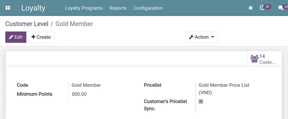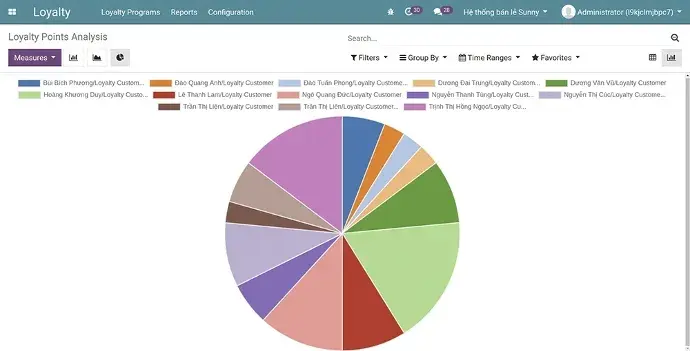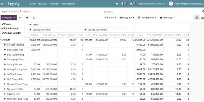 - Theo dõi và kiểm tra hiệu quả của chương trình khách hàng thân thiết dựa vào tổng điểm thưởng khách hàng tích lũy qua các chương trình: Danh sách khách hàng được áp dụng chương trình; Danh sách đơn bán; Kiểu điểm thưởng (đã chuyển đổi thành phần thưởng).