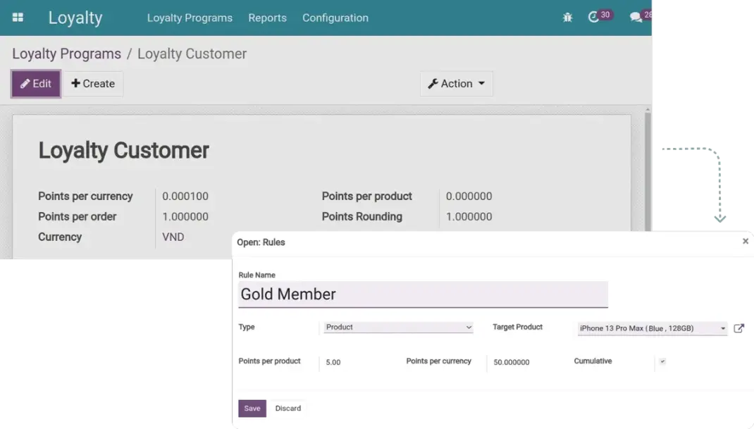 - Thiết lập các Quy tắc tính điểm linh hoạt: điểm thưởng theo giá trị đơn hàng; Điểm thưởng theo số lượng đơn hàng; Điểm thưởng theo số lượng sản phẩm mua…