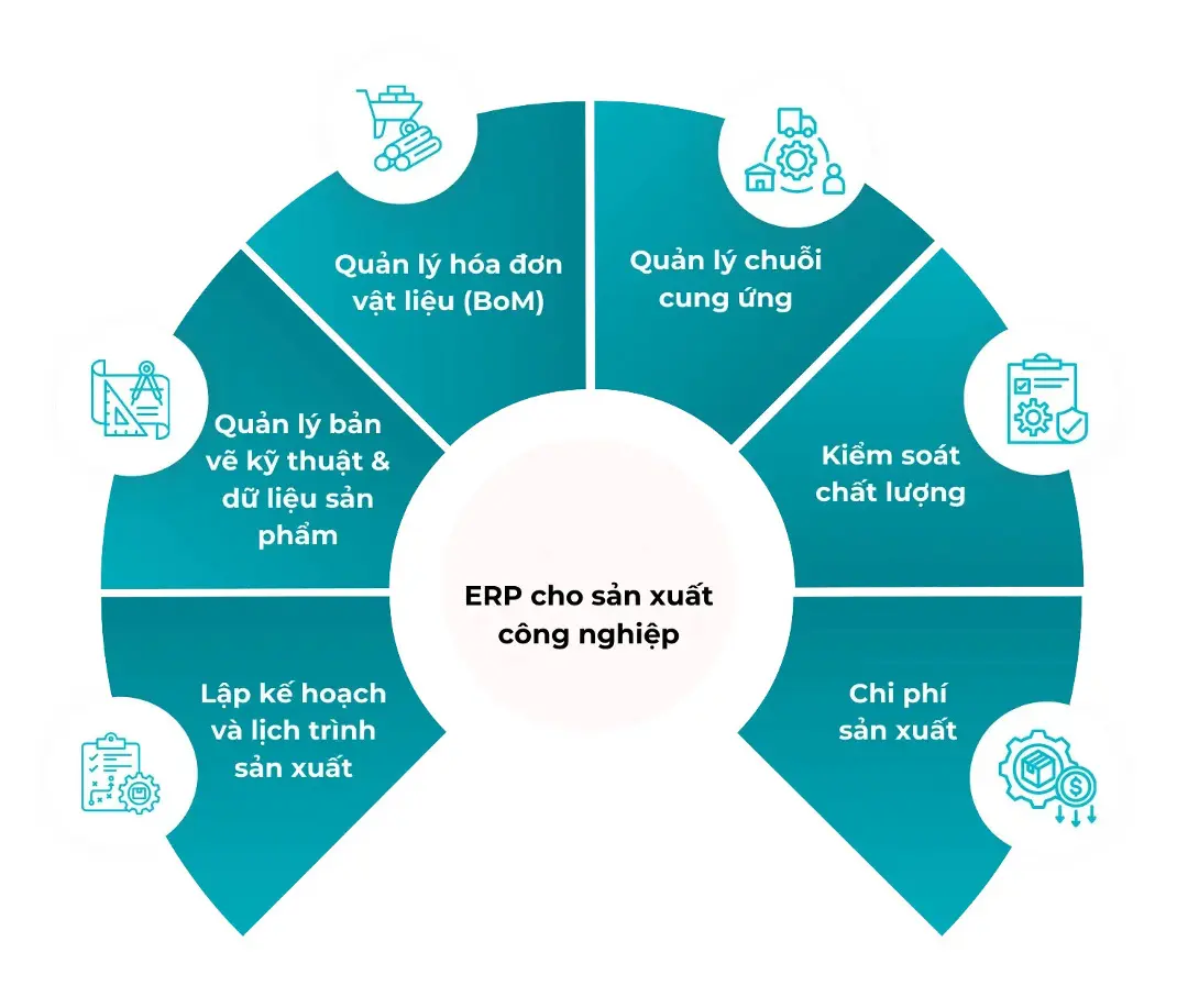 - Quản lý sản xuất: MRP + MES + PLM + Chất lượng + Bảo trì + Kho