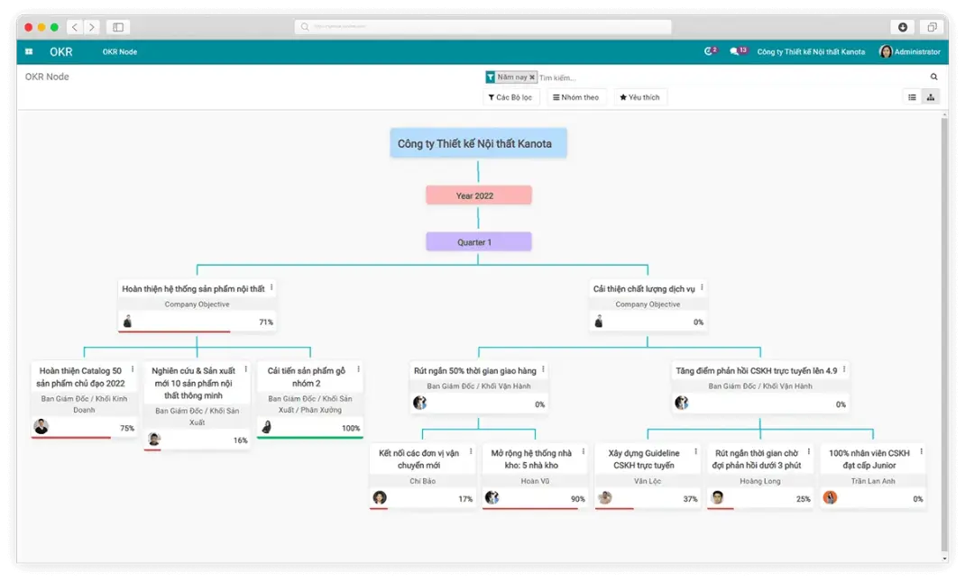 Toàn bộ nhân sự đều được xem phần mềm OKR, thấy rõ sự liên kết giữa mục tiêu công ty với mục tiêu phòng ban, cá nhân qua giao diện sơ đồ cây trực quan. Nhờ đó, nhân sự biết mình đang làm gì, phục vụ mục tiêu gì của phòng ban và toàn doanh nghiệp.