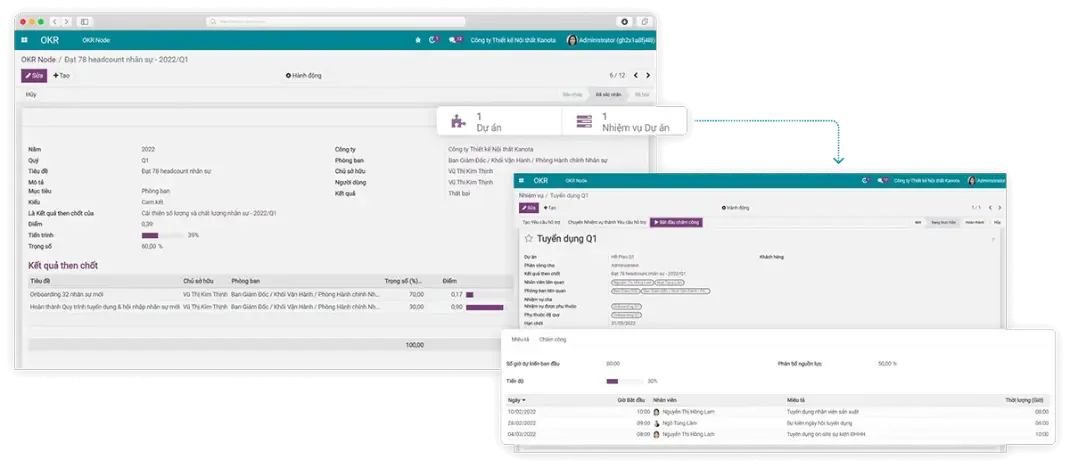 Gắn OKR với Dự án/ nhiệm vụ, giúp theo dõi tiến độ hoàn thành mục tiêu đề ra.