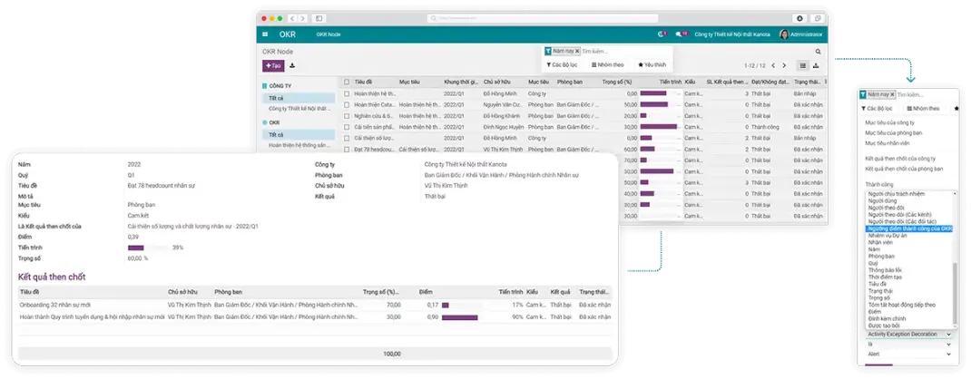 - Dễ dàng lọc, nhóm với nhiều tiêu chí, nhanh chóng tìm kiếm mục tiêu, kết quả then chốt, tiến độ công việc của nhân viên/ phòng ban liên quan theo tháng, quý, trạng thái, trọng số…