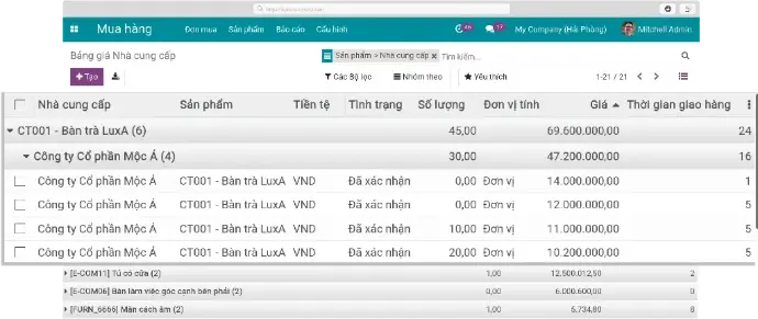 - Phân tích hoạt động mua hàng, theo dõi đơn hàng chi tiết theo ngày/tháng/quý năm. Tự động tính toán các chỉ số: giá mua trung bình, thời gian xử lý đơn hàng, số lượng đã nhận/ chưa nhận, thời hạn giao hàng theo đơn hàng mua/hợp đồng mua,...