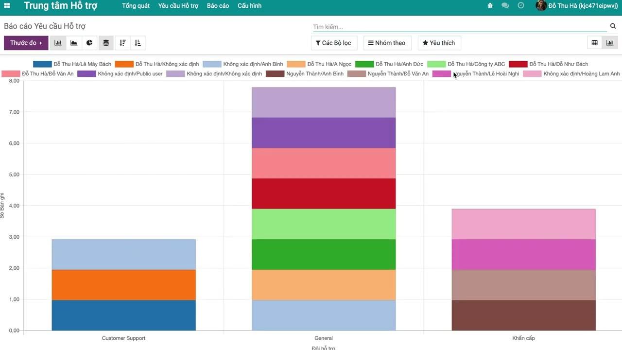 Tổng hợp Yêu cầu hỗ trợ theo nhiều tiêu chí (Hoàn thành, Chưa hoàn thành, Thời gian xử lý v.v.), báo cáo dưới dạng biểu đồ trực quan (dạng cột, đường, bánh) theo thời gian thực.