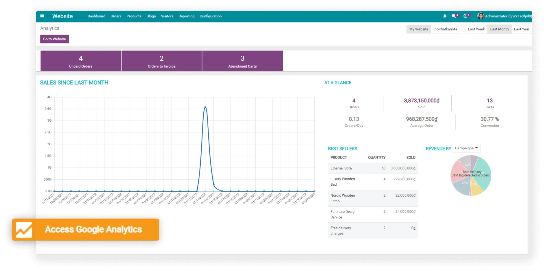 Track, manage sales orders from website, revenue by campaigns/ medium/ sources...